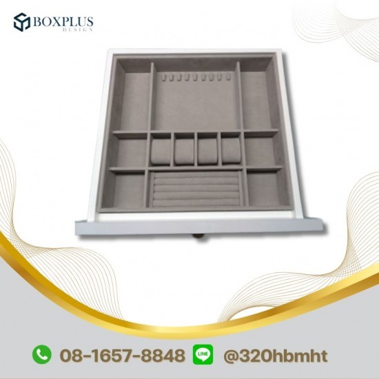 เรารับผลิตถาดไม้หุ้มกำมะหยี่ใส่เครื่องประดับในลิ้นชัก ตามสั่ง JEWELLRY BOX ตามแบบที่ต้องการ และเรามีแบบรวมไปถึงไอเดียการผลิตกล่อง และผลงานมากมายให้คุณลูกค้าเลือก ร้านค้าจำหน่ายเครื่องประดับ ร้านจิวเวอร์รี่ นำไปจัดเก็บตั้งโชว์สินค้าเพิ่มมูลค่าและความงดงามให้แก่สินค้าของคุณ เพิ่มคุณค่าให้กับสินค้า และชิ้นงานของคุณ กล่องจิวเวอร์รี่ ของเราผลิตอย่างใส่ใจ ปราณีต สวยงาม ชิ้นงานกล่อง JEWELLRY BOX ของเรานั้นเป็นชิ้นงานระดับ พรีเมี่ยม  หรูหรา สวยงาม ใครเห็นก็ต้องถูกใจ สอบถามรายละเอียดเพิ่มเติม ติดต่อมาหาเราได้เลย